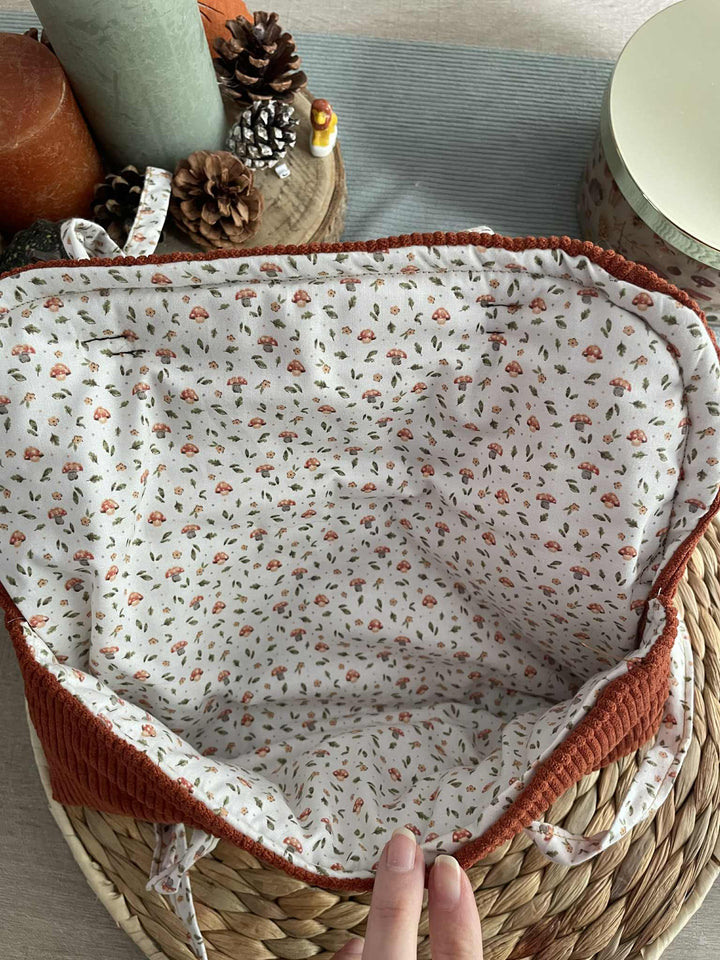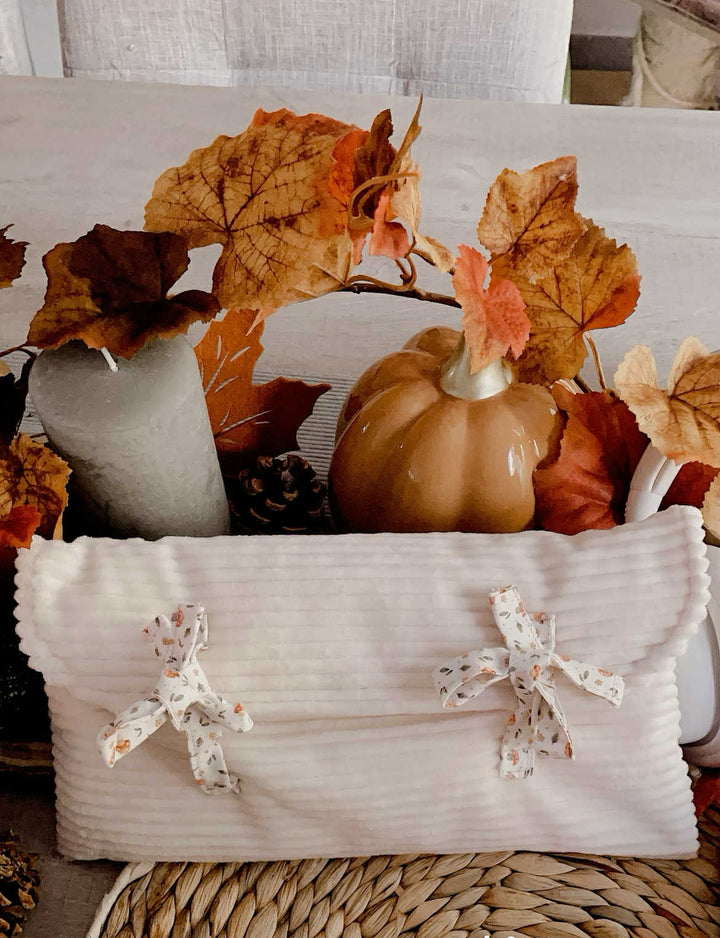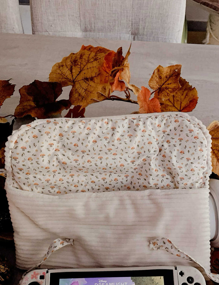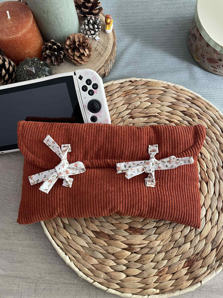 Avec son tissu aux tons chauds inspirés de la saison, cette pochette deviendra vite ton alliée parfaite pour tes sessions de jeu sous un plaid avec une tasse de thé ☕.